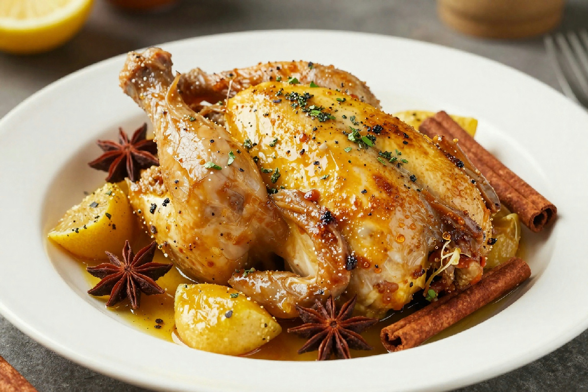 La cottura prosegue con un filo d’acqua per mantenere umido il pollo, coprendo il tegame con un coperchio. Lasciate cuocere a fuoco lento per circa 30-35 minuti, girando il pollo di tanto in tanto. La marinatura alla cannella caramellizzerà, donando al pollo un sapore avvolgente e irresistibile. Prima di servire, guarnite con prezzemolo fresco tritato: un tocco di freschezza che bilancia perfettamente il piatto.